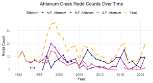[[File:Ahtanum.png|thumb|Figure X. Ahtanum Creek Redd Counts Through 2024]] | [[File:Ahtanum.png|thumb|Figure X. Ahtanum Creek Redd Counts Through 2024]] | ||